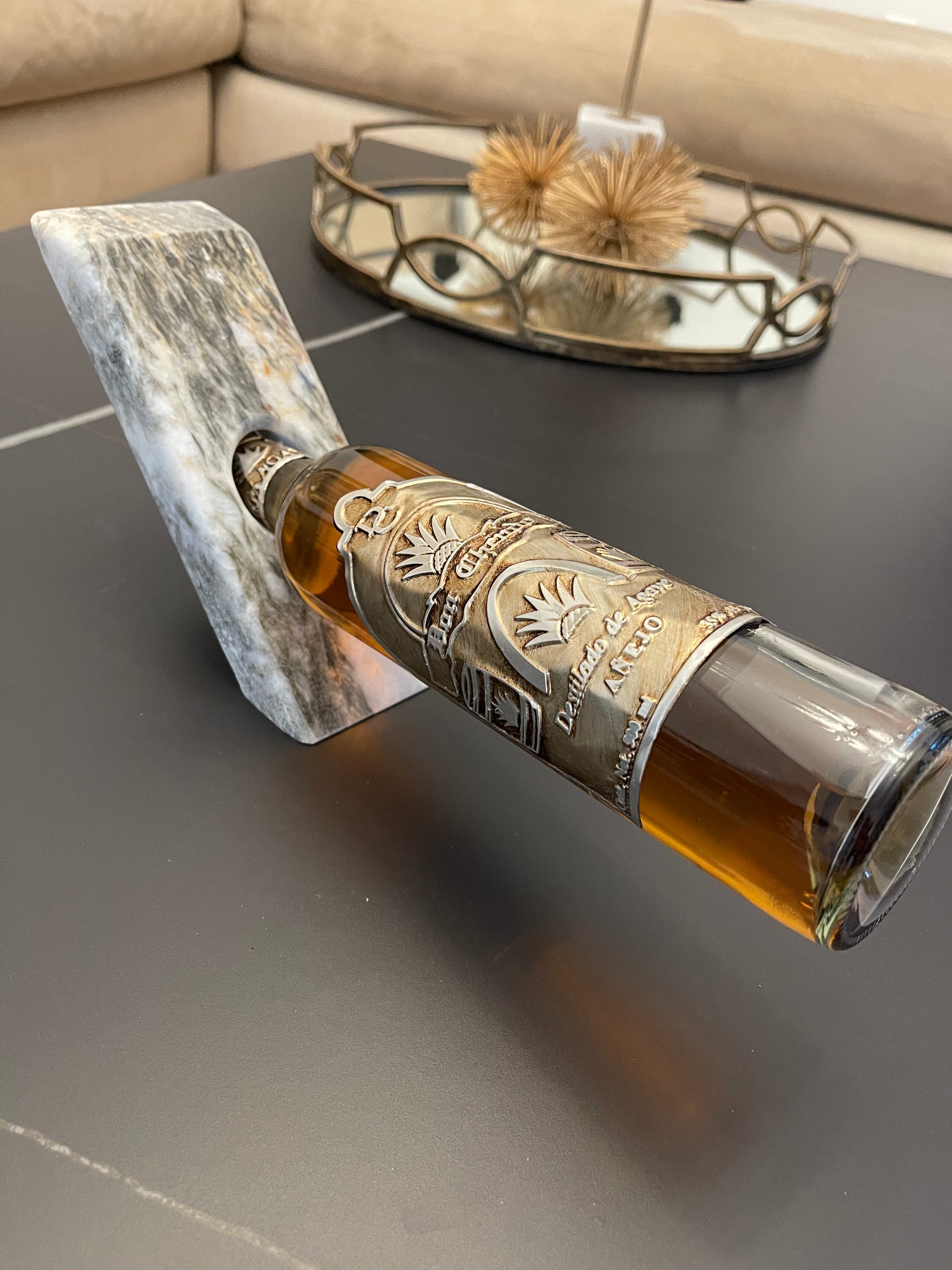 Since liquor bottles vary in size, shape and weight, your bottle will sit in each one a little differently. Simply slide the bottle further in or out until you find the spot it balances best, and you are set.